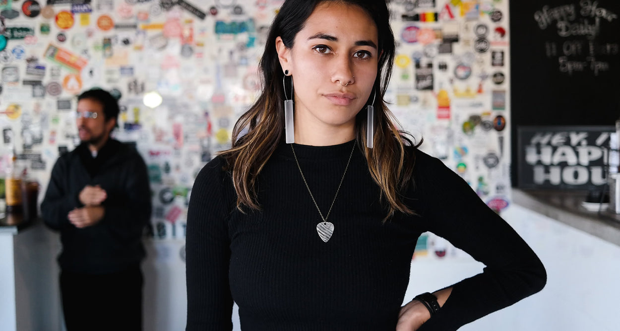 What’s broken can be beautiful works of art. An arpeggio is a type of broken chord, and this necklace is made from broken cymbals. Show your love for guitar and music with our arpeggio reclaimed cymbal necklace.